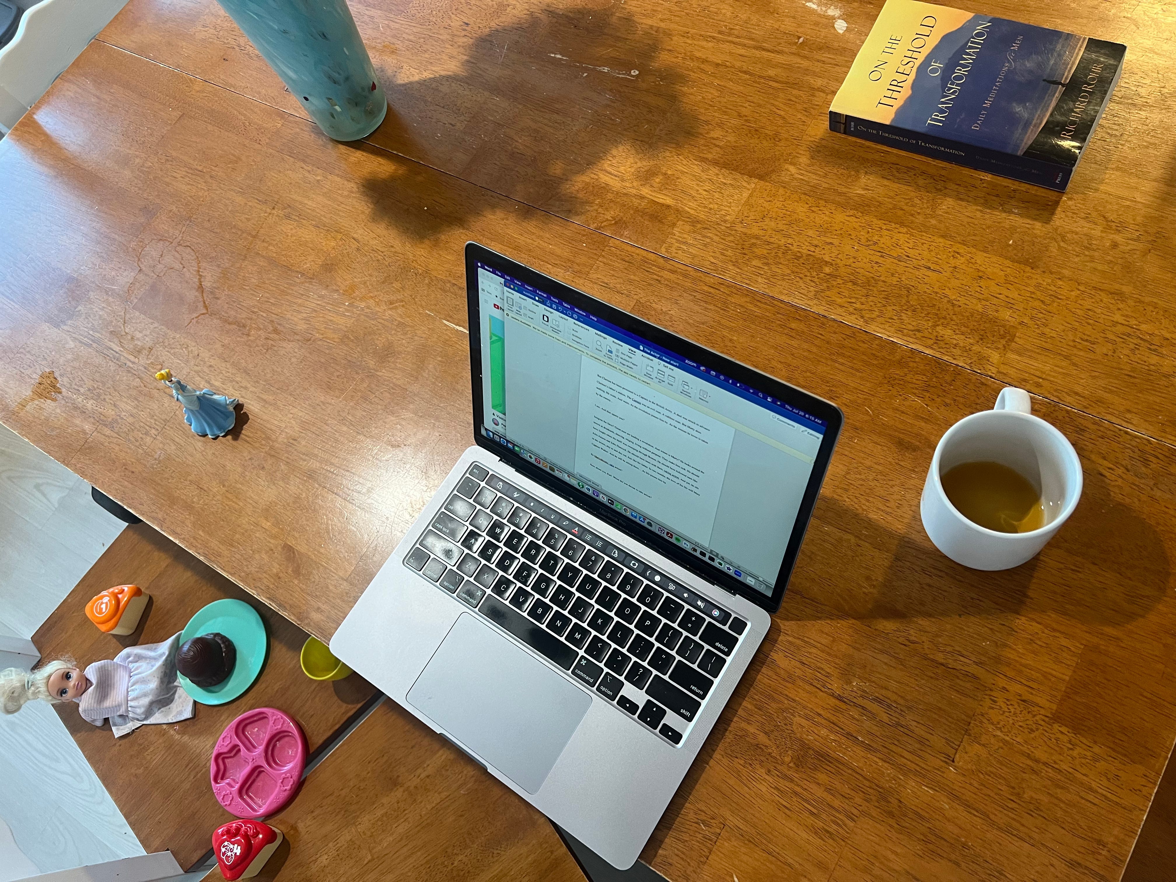 One day, maybe I’ll have a big office with a grand desk, surrounded by my own books and pictures. But for this chaotic stage of life, a kitchen table with an Elsa doll and an apple juice cup feels like the perfect sacred space.